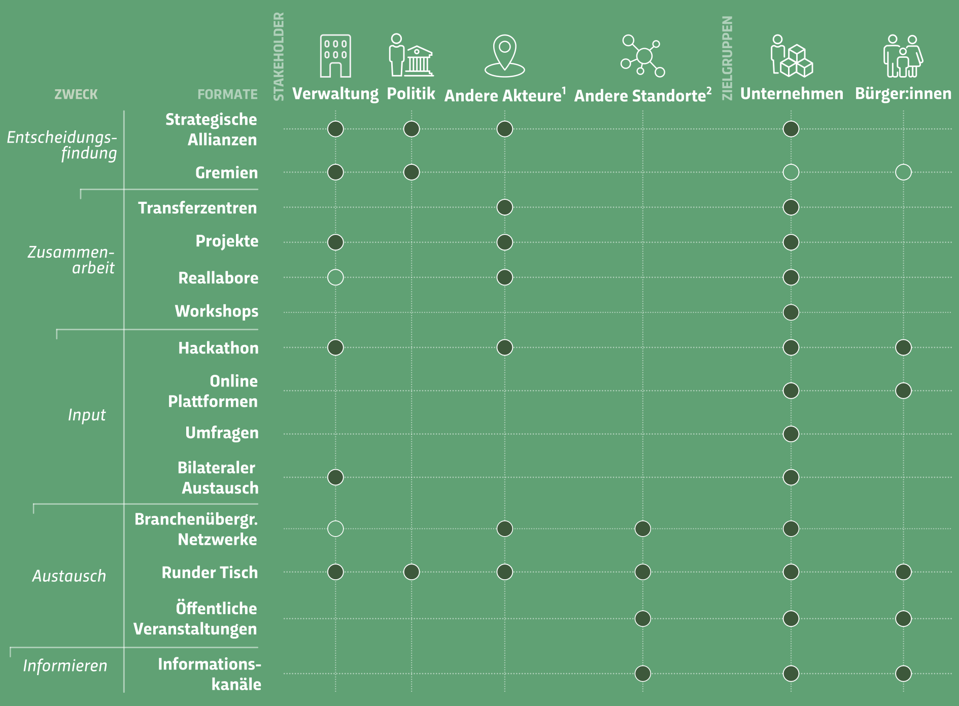 Zunächst unterscheiden wir zwischen Zielgruppen (Empfänger von Leistungen der Wirtschaftsförderung) und Stakeholder (Mitgestalter der Wirtschaftsförderung). Die Hauptzielgruppe für die Wirtschaftsförderung sind an erster Stelle Unternehmen, Gründer:innen und nur in gewissem Ausmaß Bürger:innen. Stakeholder sind demgegenüber alle Akteure, die Einfluss auf die Wirtschaftsförderungsaktivitäten nehmen oder Interesse für diese zeigen. So können die Unternehmen abhängig vom Ziel und Format als Zielgruppe oder Stakeholder agieren. Sie werden durch eine Vielzahl an Formaten uni- oder bidirektional als Impuls- und Feedbackgeber (z.B. mittels Umfragen, Runden Tischen, öffentlichen Veranstaltungen) beteiligt. Zugleich werden vermehrt Formate für die langfristige Zusammenarbeit und Vernetzung zwischen und mit Unternehmen geschaffen (z.B. Netzwerke, Reallabore, Transferzentren), um die Wirtschaftsförderungsaktivitäten an die Bedarfe der Zielgruppen anzupassen und ein gegenseitiges Lernen zu ermöglichen (Rabadjieva & Terstriep 2021b). Unsere Interviews verdeutlichen zudem, dass eine dauerhafte Kooperation mit weiteren Stakeholdern wie Politik, Intermediären oder Verwaltungseinrichtungen innerhalb von Gremien (z.B. Ausschüssen, Aufsichtsräten oder Stammtischen), Projekten oder Transferzentren (bzw. Technologie- und Transferzentren) stattfindet. Die partizipative Entscheidungsfindung bildet in der Wirtschaftsförderung vielerorts bislang noch die Ausnahme. Bis auf die Gremien, die bei amtlichen Wirtschaftsförderungen von Politik besetzt werden und bei nicht amtlichen Organisationen aus einer Mischung von Politik und ausgewählten Unternehmen bestehen, stellen strategische Allianzen (Infobox 3.1) das einzige Format zu diesem Ziel dar.
